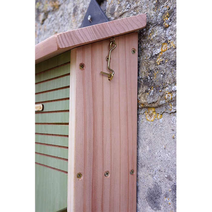 The ladder style grooves allow bats to climb into either chamber it prefers. Designed for multi-species, the chambers may accessed for inspection by licensed bat workers via the hinged roof which is secured by a removable screw.