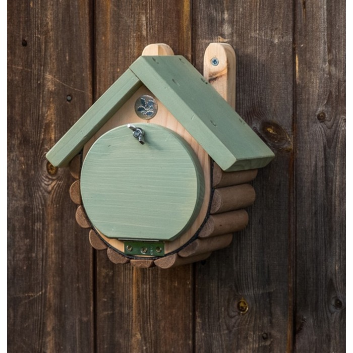 The house is beautifully made from solid timber, a recycled plastic inner skin and decorative wooden log outer providing extra insulation. This mini mammal house is ideal for use in dormouse conservation projects or as a snug home for other small garden mammals such as harvest mice, bumble bees and even birds may use it as a home. The round entrance hole is at the rear of the house. The hinged green inspection door at the front is opened using the wing-nut .