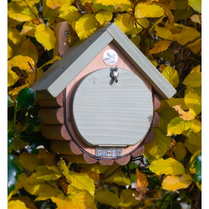 The house is beautifully made from solid timber, a recycled plastic inner skin and decorative wooden log outer providing extra insulation. This mini mammal house is ideal for use in dormouse conservation projects or as a snug home for other small garden mammals such as harvest mice, bumble bees and even birds may use it as a home. The round entrance hole is at the rear of the house. The hinged green inspection door at the front is opened using the wing-nut .