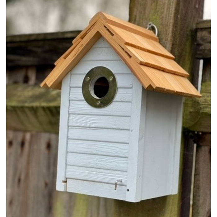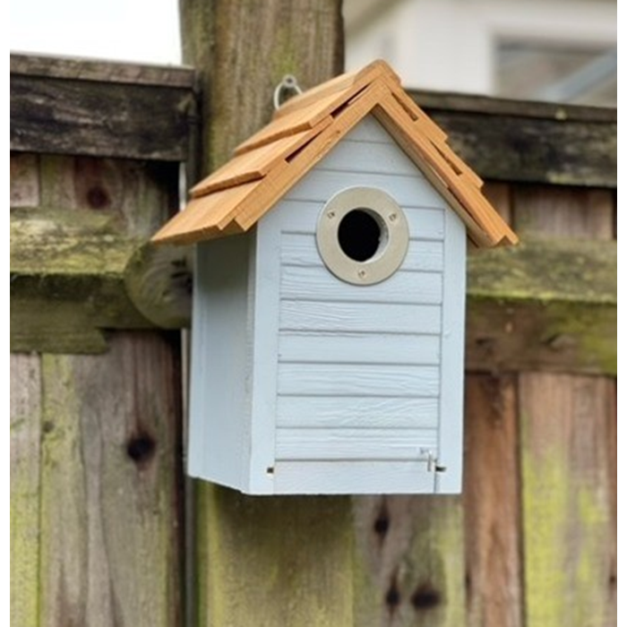 An attractive well priced pine nest box in a powder blue finish with a cedar clad roof. Gardman Beach Hut Nest Box is a great way to help birds during the breeding season. Its constructed from high quality robust sustainably sourced certified timber and conforms to the BTO nest box standards. Its predator resistant stainless steel front plate and thick roof is sure to keep its inhabitants protected throughout the season. Its decorative, modern and comes in two colours.