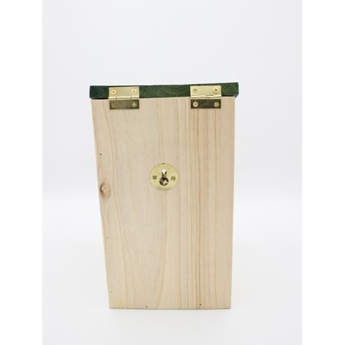 Traditional wooden nest box. It has a 32mm diameter hole that allows the bird to enter inside. It also features a slanted green roof and small entrance hole to protect birds from the elements.