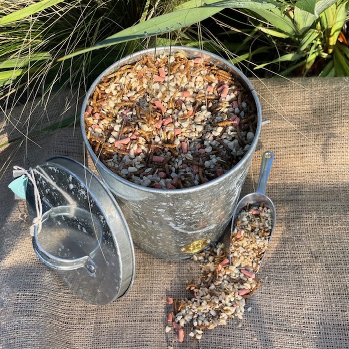 This lovely galvanised pest proof bird food tin stores your bird food safely. It comes with handy scoop that hangs on a hook on the side of the tin complete with 2KG of Christmas Crumble™