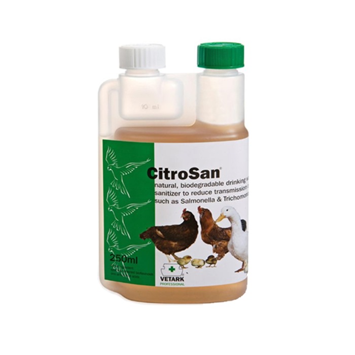 Vetark CitroSan is a palatable, non toxic and GM -free.It is a very good natural sanitizer against a wide range of pathogens and also acts as a stimulant for natural immunity. Use regularly in drinking and bathing water, to minimise the risk of transmission of disease. Citrosan has been shown to inhibit the transmission of Trichomonas in poultry - and may help prevent trichomoniasis outbreaks in greenfinches. It will also help to improve the survival of fledglings during the breeding season.