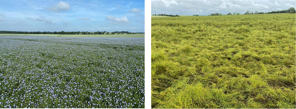 Field of Blue Flowering Winter Linseed Yellowed and Flat Linseed After the Rain