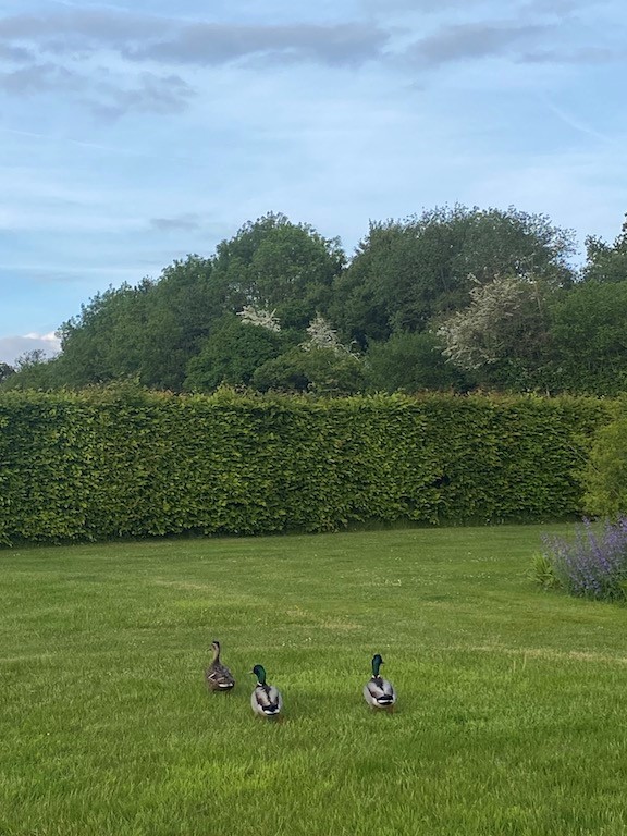 Last month we had 2 moorhen in the garden and this month we have been joined by 6 delightful mallards (2 groups of 3, with 2 drakes and a duck in each group). We don't really know where they have come from but we are enjoying their company. We don't (yet) have a pond in the garden - so they have been making do with the water trough, politely taking it in turns to do their ablutions. However, as shown above, the bucket came into use today and it did make me laugh out loud. "Bottoms up!"