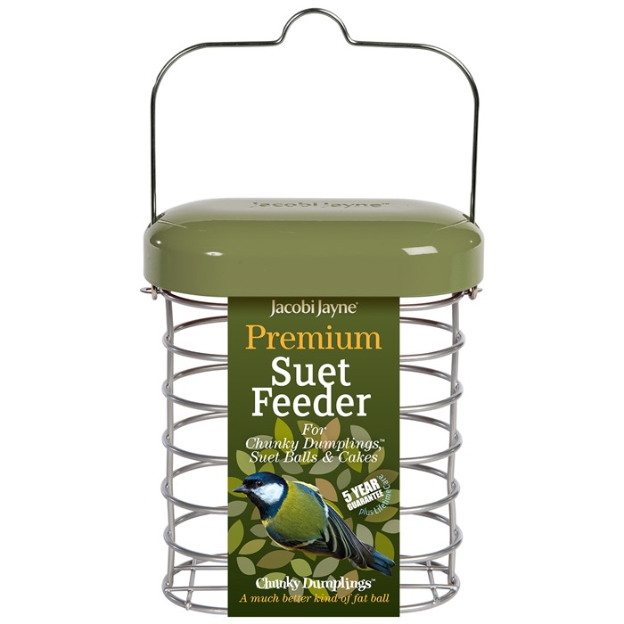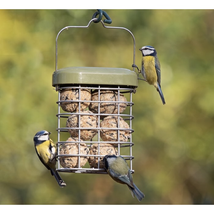 This tough steel chew-proof cage holds up to two regular-sized suet cakes or six fat balls, with an easy-open, colourful protective lid.